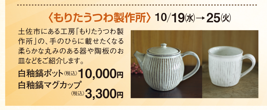 INFORMATION 【高知大丸催し】Discovery高知 10/12水〜10/25火 Posted on 2016年10月19日 by moritautsuwa 【高知大丸催し】Discovery高知 10/12水〜10/25火 本日より高知大丸である催し【Discovery高知】に出品しています。高知の人・モノ・コト発見!という事で県下の美味しい食べ物や特産品の展示販売が行われるようです。もりたうつわ製作所は高知大丸本館5階家庭用品のスペースで陶器類を展示販売させて頂いております! 【高知大丸催し】Discovery高知 期間 10/12水〜10/25火 場所 高知大丸本館5階家庭用品コーナー moritautsuwa moritautsuwa の投稿をすべて表示