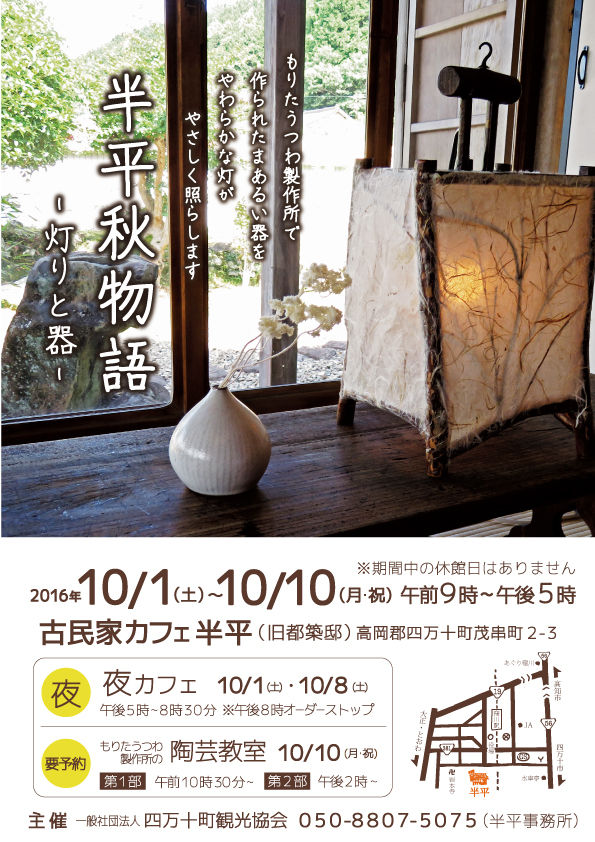10/1(土)〜10/10(月・祝)四万十町にある【古民家カフェ半平】にて『半平秋物語-灯りと器-』にコラボ参加します。毎年行われているという灯り展。今年はもりたうつわ製作所のうつわと共に楽しんで下さい^^10/1(土)と10/10(月・祝)は夜カフェも行われるそうなのでぜひ足を運んでみて下さい♪